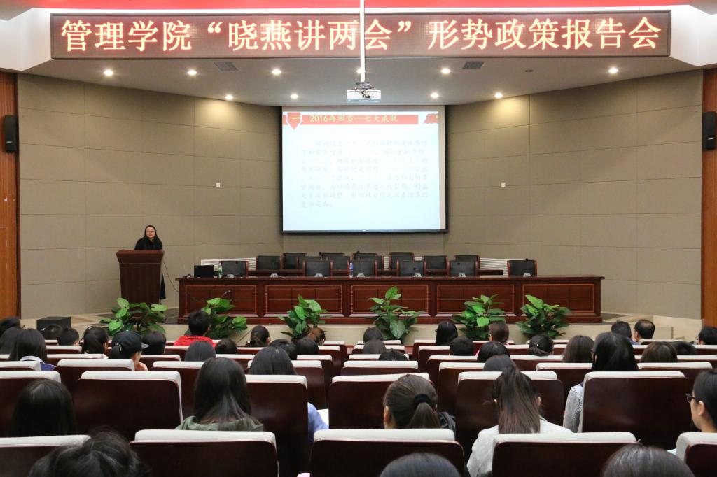 为进一步加强思想政治工作,深入开展“两会”精神的贯彻学习,深刻理解和把握以习近平总书记为核心的党中央提出的治国理政新思路、新理念、新战略, 2017年4月20日下午,管理学院在图书馆报告厅举办第三届“晓燕讲两会”形势政策报告会,学院经济系主任郝晓燕教授作报告,全院教师,员工党员和部分员工代表参加报告会。
